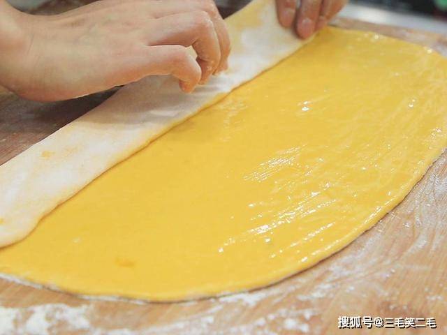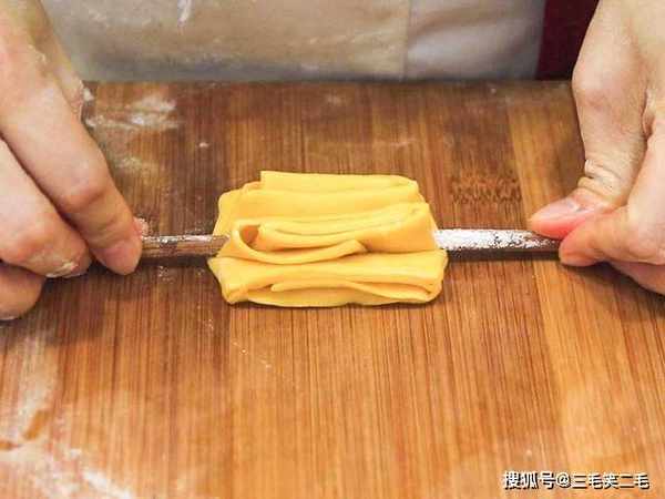 在案板上面撒上面粉 ,取出面团经过搓揉挤压排出空气,搓揉成一个圆面坯 ,用擀面杖擀成稍厚点的面片,倒上一点植物油 用刷子刷匀,然后从一边往另一边开始折,一点一点的折起来,折完以后把多余的面片切下来,然后切成三厘米左右的方块。