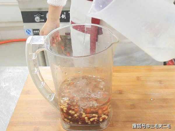 红豆、黄豆、花生各一把清洗干净以后放到豆浆机里,加入适量的清水打成豆渣,因为要做的是五谷窝窝,不能打得太碎了,要有些颗粒感,打好以后豆浆喝掉,我们只用豆渣。