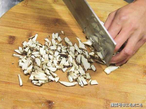 两根火腿肠切成颗粒;几朵香菇去掉根部,切成香菇粒。