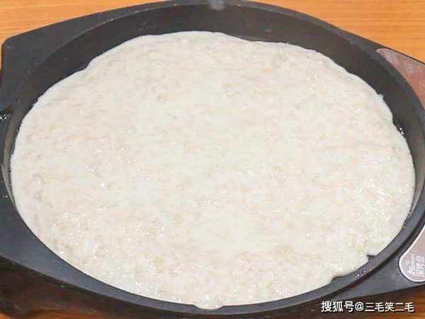 起锅开小火,刷上植物油,油温五成热时,把面糊倒出锅中,用勺子背摊成薄厚均匀的圆形面饼,盖上锅盖烙2分钟。