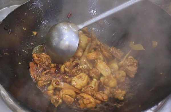 6、鸡块炒香,微微变色以后,加入老抽3克、生抽5克、把颜色炒均匀,然后沿锅边倒入适量的开水,水量要没过鸡块,鸡块想要软嫩鲜香,一定要加开水。凉水容易使蛋白质凝固,炖出来的鸡块比较干柴。
