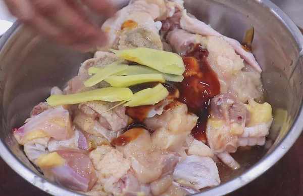 3、然后把浸泡好的鸡块再次清洗干净,沥干水分腌一下,鸡块经过以上处理能够省去焯水的步骤,不容易流失鸡油,炖出来更香,加入胡椒粉2克、蚝油10克增鲜、料酒10克去腥,放入姜片,用手抓匀腌制15分钟。