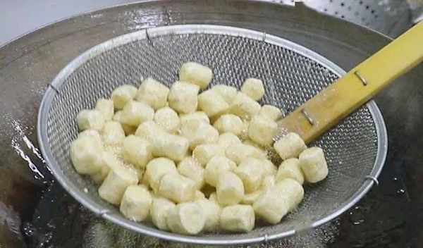 3、锅内烧油,把山药倒入笊篱中抖掉多余的淀粉,油温四成热时倒入山药,开小火浸炸,把山药炸熟、炸透,这一步油温不能太高,不然容易出现表面炸糊、里面还不熟的现象。