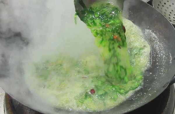 4、大约熬制3分钟,小米开花以后,把芥兰倒入锅中,搅拌均匀,烧开后勾入半勺芡粉,把小米羹调的稠一点,以免过于寡淡,用勺子快速搅匀,小米羹再次煮开以后即可装盘上桌。