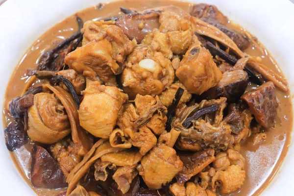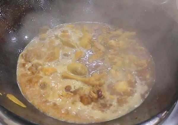 7、调味加入食盐2克,大火烧开以后打去锅中的浮沫,然后转为小火焖煮15分钟,把鸡块焖熟,让其吸收汤汁入味,15分钟以后把锅中的香料挑出来,倒入准备好的菌菇翻匀,继续焖煮5分钟。让菌菇的鲜味和鸡块香味充分融合在一起,最后稍微收一下汤汁,美味即成。