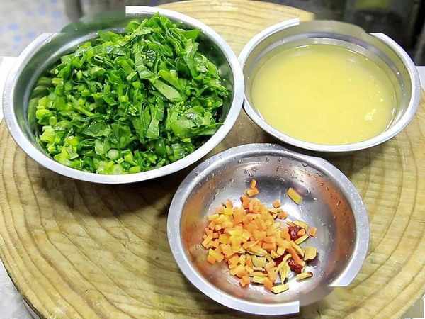 1、准备鲜嫩的芥兰一小把,切成碎末,也可以根据自己的口味,换成其他时令蔬菜。准备一把小米,放入清水中 抓洗干净以后,浸泡10分钟,把小米泡开,更容易煮熟。再切一点红枣粒,增加小米羹的营养,胡萝卜一小块、切成丁,用来配色。