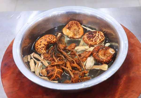 1、首先准备适量的鸡腿菇、花菇和茶树菇,一起放入清水中泡发,菌菇类最好不要用热水浸泡,鲜味容易散失,而且会流失营养。