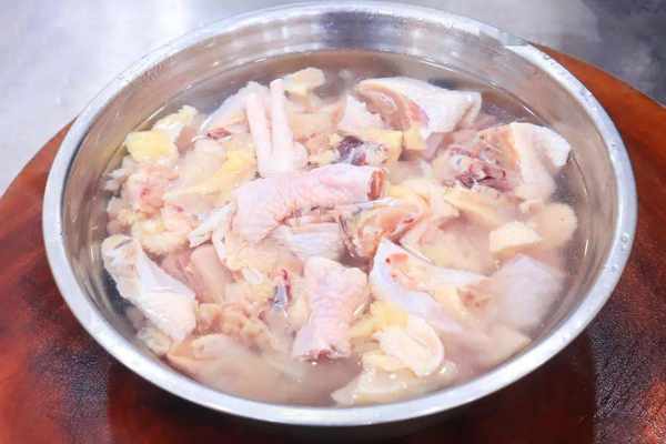 2、准备一只三黄鸡,去除气管,把鸡肉剁成均匀小块,炖好以后用清水把上面的血渍洗干净,然后加入一勺食盐抓匀,浸泡10分钟,充分去除里面的血水。