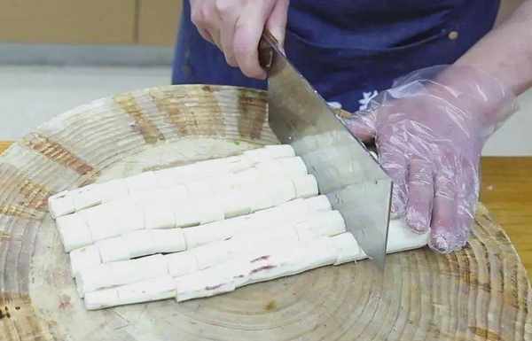 1、口感比较软糯的淮山药,营养价值高。逐个削去外皮,用清水冲洗干净,整个处理过程最好戴上手套,以免皮肤引发皮肤过敏,然后把山药切成一厘米左右的段,用清水泡上隔离空气,防止氧化变黑。