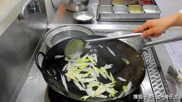 4.下面我们开始烹饪,锅内烧油,油热后倒入大葱段,开始翻炒,把大葱炒至断生后倒出。