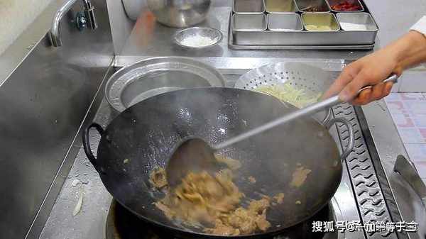 5.锅内再次烧油,油温不要过高,倒入羊肉,开中火滑炒片刻,这个时候,羊肉可能会析出一些汁水,不用管它,继续滑炒1分钟,粘连在一起的,用勺子打散,析出的汁水会慢慢炒干。