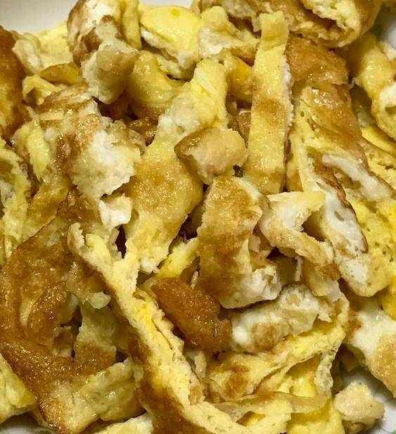 这应该是油条切出来的细条,如果有网友在街上吃过春卷的话,应该知道每次买春卷老板都要问是加油条还是香肠还是加鸡蛋呢?我想大家这点应该很熟悉吧!