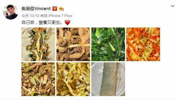 随着网络时代的到来,不少港台明星也渐渐的玩起了微博,所以对于粉丝们来说多了一个和偶像互动的机会和渠道,近日焦恩俊在自己的微博自曝自制美食春卷,真的是色香味俱全呀!