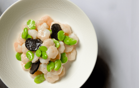 另一道松露搭配豆瓣河虾仁,巧妙运用了黑松露的香气,激发不同食材本身香味。主厨通过粤式烹饪技艺,将应季河虾仁与春季蚕豆瓣合炒,鲜香清甜扑鼻而来。虾仁粒粒饱满,色泽鲜亮,翠绿的蚕豆点缀其中。最后,将黑松露刨片散落于菜品之上,独特的香味融入其中,鲜美馥郁。