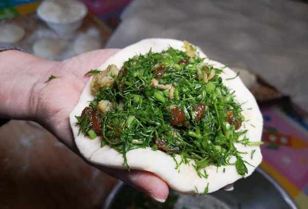 第四步:取出预先做好的酥皮,做成拳头状的面团。用擀面杖擀薄后,加入所需量的菜馅,卷起对折,包上菜馅。