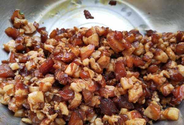 第三步:洋葱和茴香蒸熟后,汤就很容易熬了,可以把油条切碎,放入菜馅里。油条比较干,可以吸收菜馅的汤汁,所以包子的皮不吸收汤汁,不会变成死疙瘩,包子更软,更好吃。将茴香、油条和卤肉放入碗中,加入适量的盐、食用油和香油拌匀。