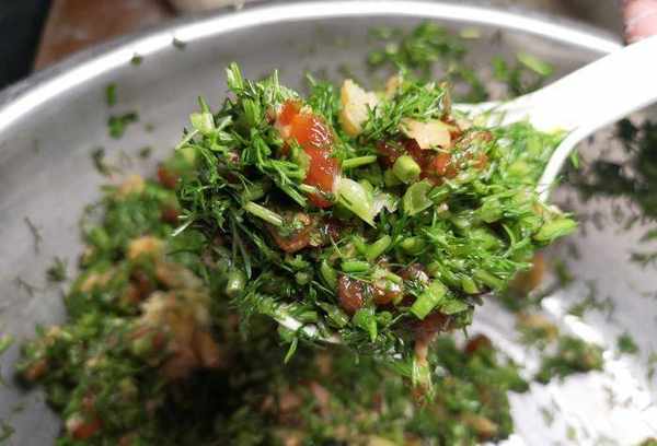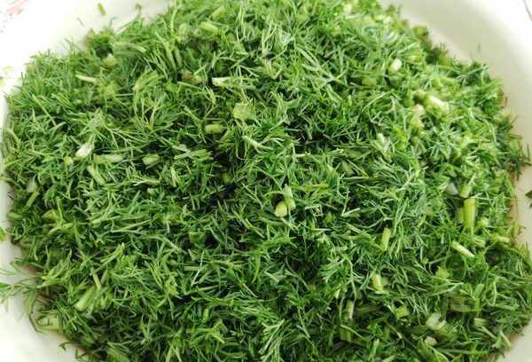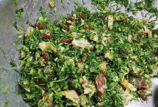 第二步:小茴香洗净,检查水分,切碎,切成0.5厘米左右的小块。有很多朋友不喜欢吃茴香,因为茴香很难吃。用过的刀、砧板和锅里装满了切碎的茴香,应该彻底清洗。