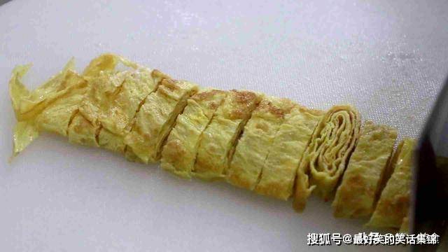 4.淋植物油,能使蛋饼脱离,鸡蛋饼周围翘起时翻面,把另一面也煎黄煎定型即可出锅,把煎好的蛋饼叠起来,切成宽条备用。