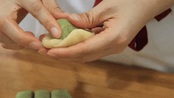 油酥团颜色揉均匀后,都搓成长条,并切成4个均匀的剂子。取出之前松驰的油皮,揉光后先搓成粗条,也切成12个大小均匀的小面剂子。之后用油皮包住油酥,收口时要收结实一点,等把每个色彩的油酥都包完后,盖上保鲜膜松驰10分钟。这个期间取出一点红豆沙,然后团成豆沙球备用 ,每一个豆沙秋在25克左右。