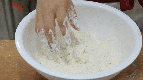接下来,我们做一点油酥。取90克面粉和45克猪油,用手把猪油和面粉抓拌均匀,把猪油和面粉充分结合。这里注意一下面粉和猪油的比例,否则油酥太酥了,不容易和成团。