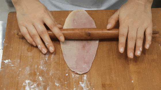 把松弛好的油酥团取出,用擀面杖擀成牛舌状。擀好一个后先卷起来,然后按照这个步骤,依次把剩余的也擀好。全部擀完之后,按照上面的步骤再重复擀一次。这样做,是为了一口酥更好的分层和起酥。