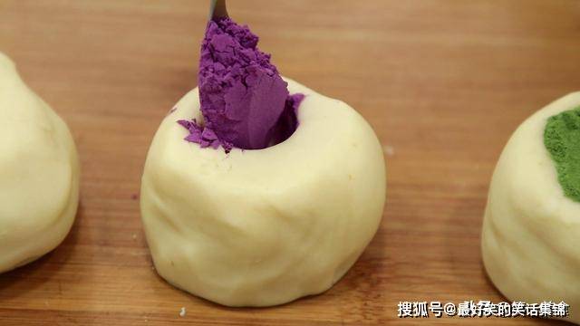把和好的油酥切成三等份,用勺子在三个油酥团的最上面,各按上一个窝。之后分别倒上绿色的菠菜粉、紫红的紫薯粉和暗红色的红曲米粉,用量以两勺为宜。