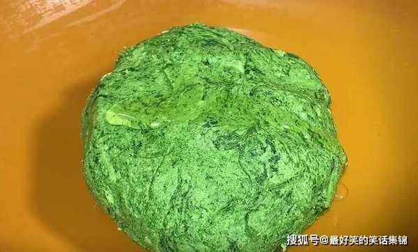 5、将艾草和糯米粉混合,就变成一个面团,大家可以放点食用油在里面按摩,因为面粉是比较粘手的,放点食用油可以避免粘手。