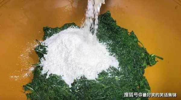 4、将艾草挤干水分放在碗中,然后再放入500克的糯米粉,加入两三勺的砂糖混合搅拌,如果大家不喜欢吃太甜的话,砂糖就不用放太多。