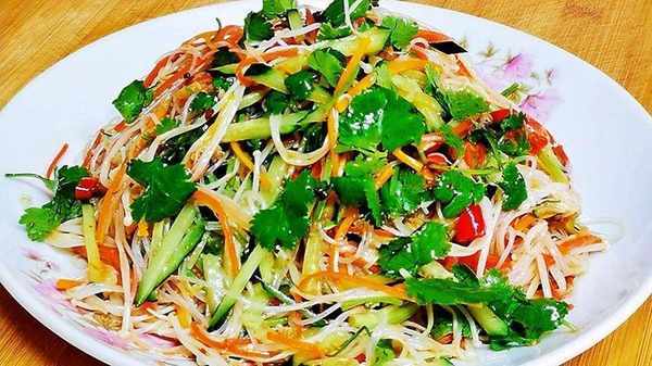 2、锅中烧开水,将粉丝放入锅中煮八秒,捞出放入冷水中冷却。接下来,将切好的胡萝卜和金针菇一起煮约15秒至变软,全部沥干,放入冷水中冷却。然后沥干水分,放入碗中备用。
