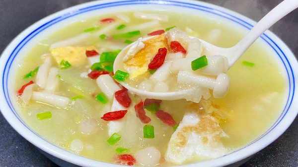 2.油热后,加入切好的葱花和香菇炒香。然后放冬瓜,下锅煎熟,放姜片和鸡蛋片。一定要倒入开水,这是熬出浓稠白汤的关键。开水可以激发所有成分的新鲜香气。将汤煮至冬瓜透明变软,加入一勺盐、胡椒粉、糖提鲜,撒上葱花和枸杞,大功告成。