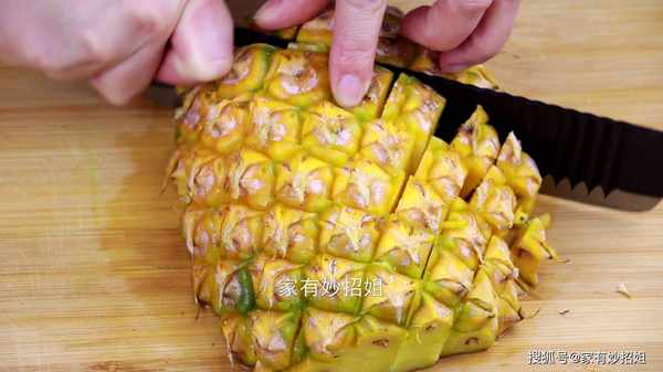 一边的纹路切好,我们换个方向按另外一边的纹路将菠萝也切好。切的时候,我们可以用手按压着菠萝,以免菠萝滑动,切歪了或切到自己的手了。