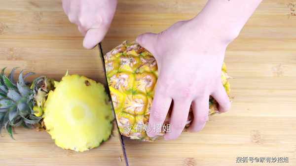 我们先把这半个菠萝倒扣在案板上,注意观察我们可以发现,菠萝的外皮是有纹路的,接下来,我们只需要用刀顺着菠萝的纹路将它切开来。