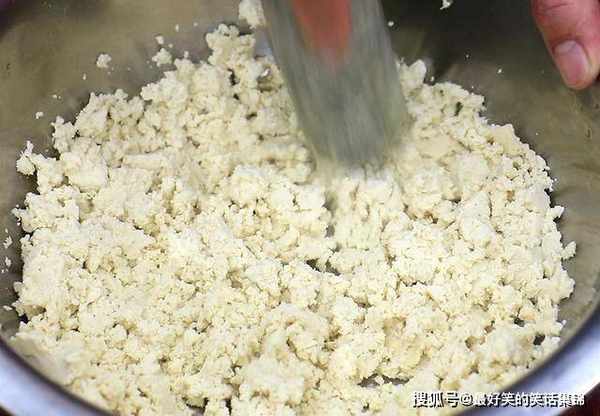 3.把腌好的冬瓜丝放入棉布里面,使劲挤出里面的汁水以免丸子出水、不成型,挤出来的冬瓜水先放到一边备用,把冬瓜丝和豆腐放在一起抓拌均匀。
