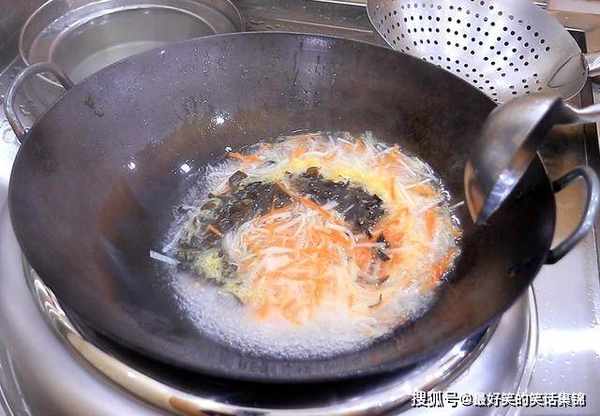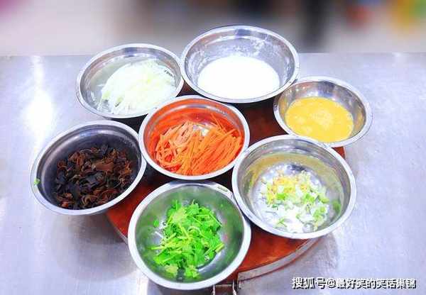 1.把木耳放入清水中浸泡1个小时,泡软以后捞出来切碎;冬瓜一块,去除瓜皮和瓜瓤,切成细丝;胡萝卜半根也切成细丝;再准备一根火腿,切成同样的细丝,再切点葱花和姜末。