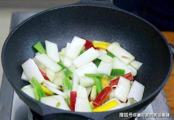 3.锅内加入清油,放入葱花爆香,倒入冬瓜和彩椒片,开大火快速地炒匀,加入适量的食盐、鸡粉翻炒化开,沿锅边淋入一点清水。