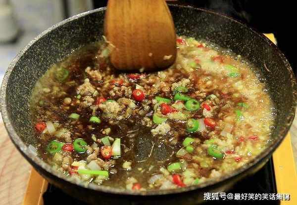 6.再次把锅中的油烧热,倒入肉末炒香、炒出肥油,肥肉炒至透亮闻到香味以后,倒入葱姜蒜和青红辣椒圈,转大火炒出香辣味,沿锅沿锅边倒入适量的温开水,把汤汁煮至沸腾转小火,把剩下的老抽倒入锅内。