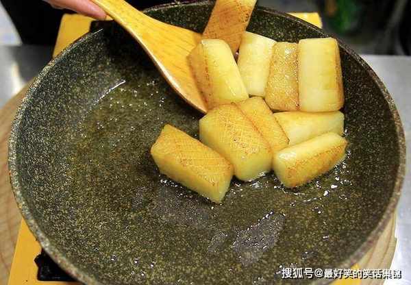 5.取出平底锅烧热,加入适量的植物油,油温五成热时,把冬瓜刷老抽的那一面放入锅中,开小火慢慢煎至上色,翻过来把四周都煎成金黄色时盛出来备用。