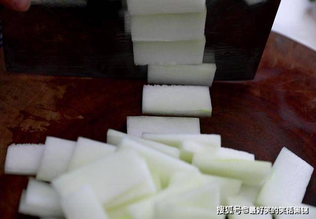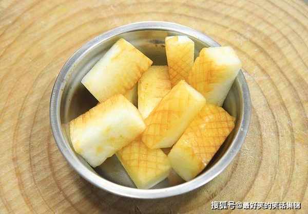 1.准备半个冬瓜,把外皮削干净,去除瓜瓤后先切成薄片再切成冬瓜丁,切好以后加入一勺食盐,用筷子搅拌均匀腌制10分钟。