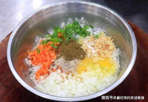 2.准备半根胡萝卜,先切成片再切成小丁,和腌好的冬瓜放在一起,放入适量的葱花,打入两个鸡蛋,加入一小把虾米,一勺胡椒粉,一勺花椒粉搅拌均匀,让调料和食材均匀融合。