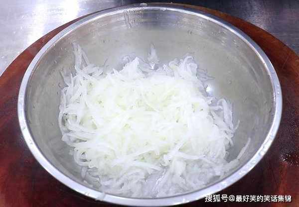 1.准备半个小冬瓜,去除外皮,用小勺挖出瓜瓤,把冬瓜洗一下用刮板擦成细丝,在冬瓜丝中加入一勺食盐搅拌均匀,腌制10分钟杀出里面的水分。