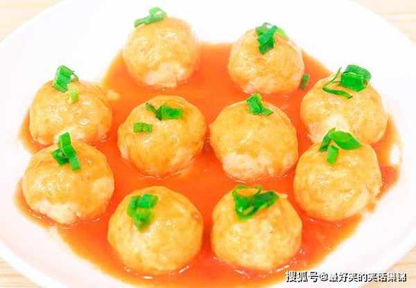 7.淋入一点水淀粉,把番茄汁收至粘稠气泡时关火,这个时候丸子也蒸熟了,把它取出来,均匀浇上番茄汁,撒上葱花,这道简单营养的茄汁冬瓜丸就做好了。