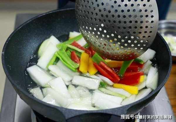 2.烧半锅开水,倒入冬瓜焯水20秒钟,再倒入彩椒片稍微烫一下捞出来备用。