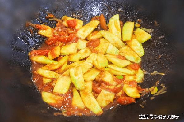 番茄炒碎、炒出沙以后倒入瓠子。淋入生抽5克转大火快速翻炒1分钟,让瓠子吸收番茄汁入味。
