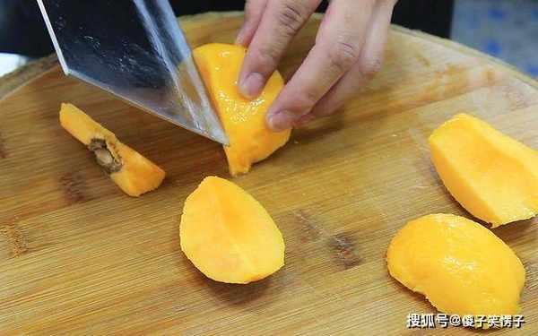 剥去黄桃的外皮以后,把黄桃切成小块放在盆中备用