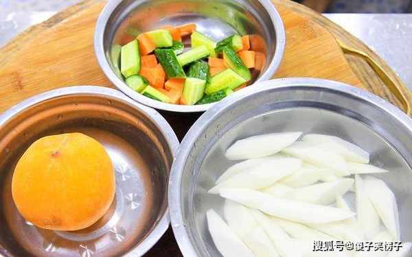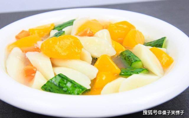 锅内再烧水,倒出泡山药的水,再把山药放在锅中。水烧开以后,打去锅中的浮末,放入黄桃,最后再倒入黄瓜丁和胡萝卜丁,很快就倒出全部的食材控水。