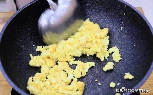 碗中打入四个鸡蛋,加入少许食盐,用筷子快速把鸡蛋搅散。锅烧热,加入适量的植物油,把蛋液倒进去,快速炒散、炒熟,然后倒在案板上切成鸡蛋碎。