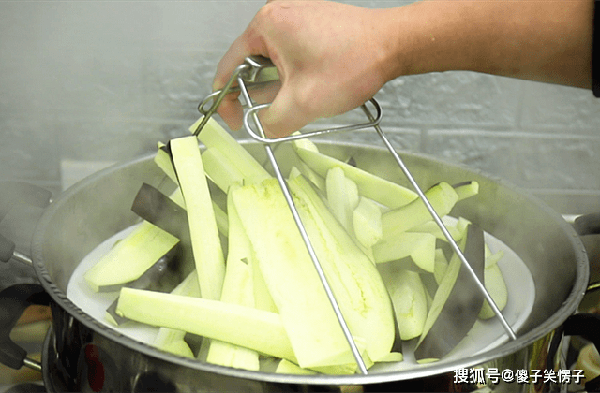 2.食材全部准备好以后,我们开始炸茄子,炸茄子时,油温要高一点,大概