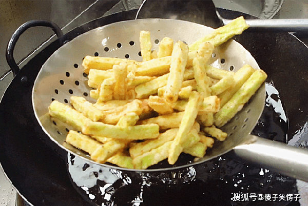 左右,茄子炸酥,表面看起来变黄的时候,捞出来,随后,升高油温至