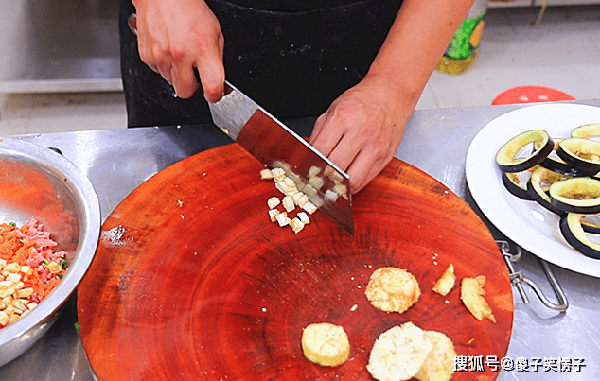 。胡萝卜切成碎粒,火腿肠切成碎粒,小葱切成葱花。取出茄子片,挖出茄子瓤,把茄子瓤切成小粒。