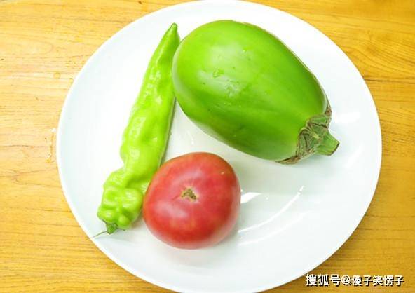 1.做烧茄子用青茄子、紫茄子都可以,把外皮削干净,切成菱形块,青红椒主要是用来配色,不需要太多,切成菱形片、滚刀块都可以,再切一个番茄西红柿,上色用。